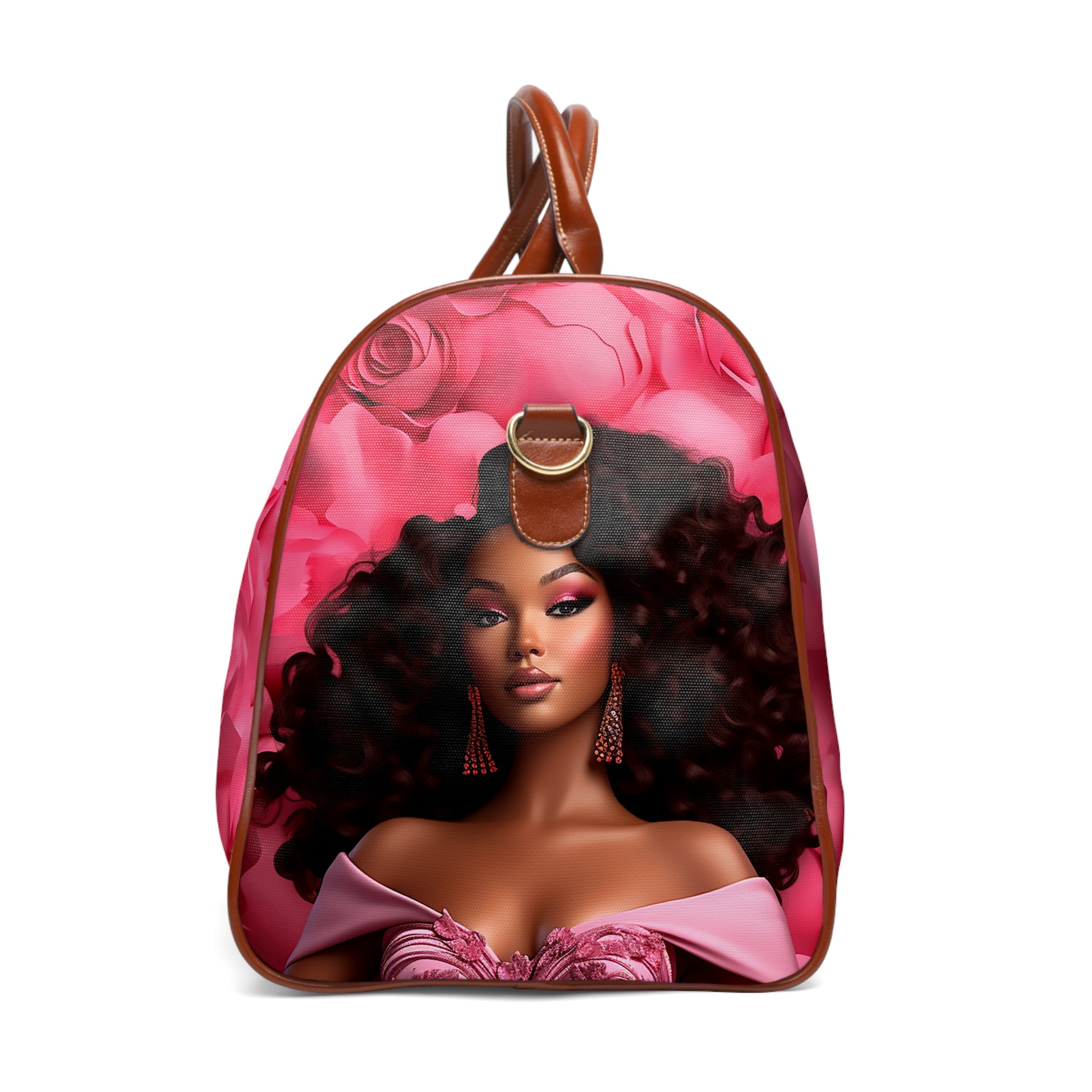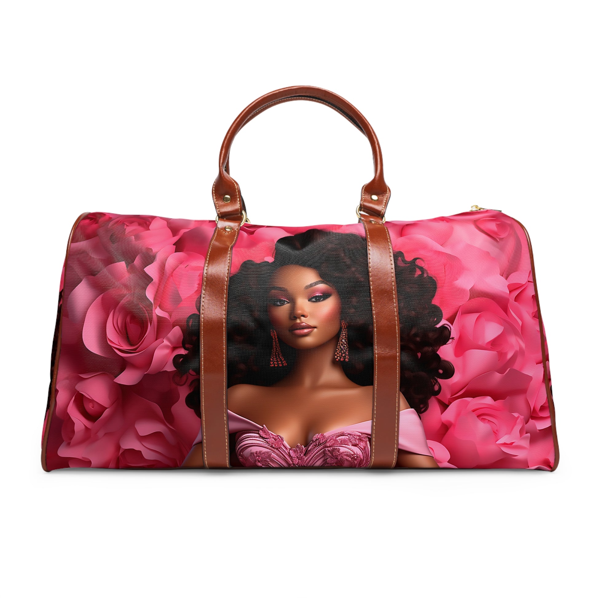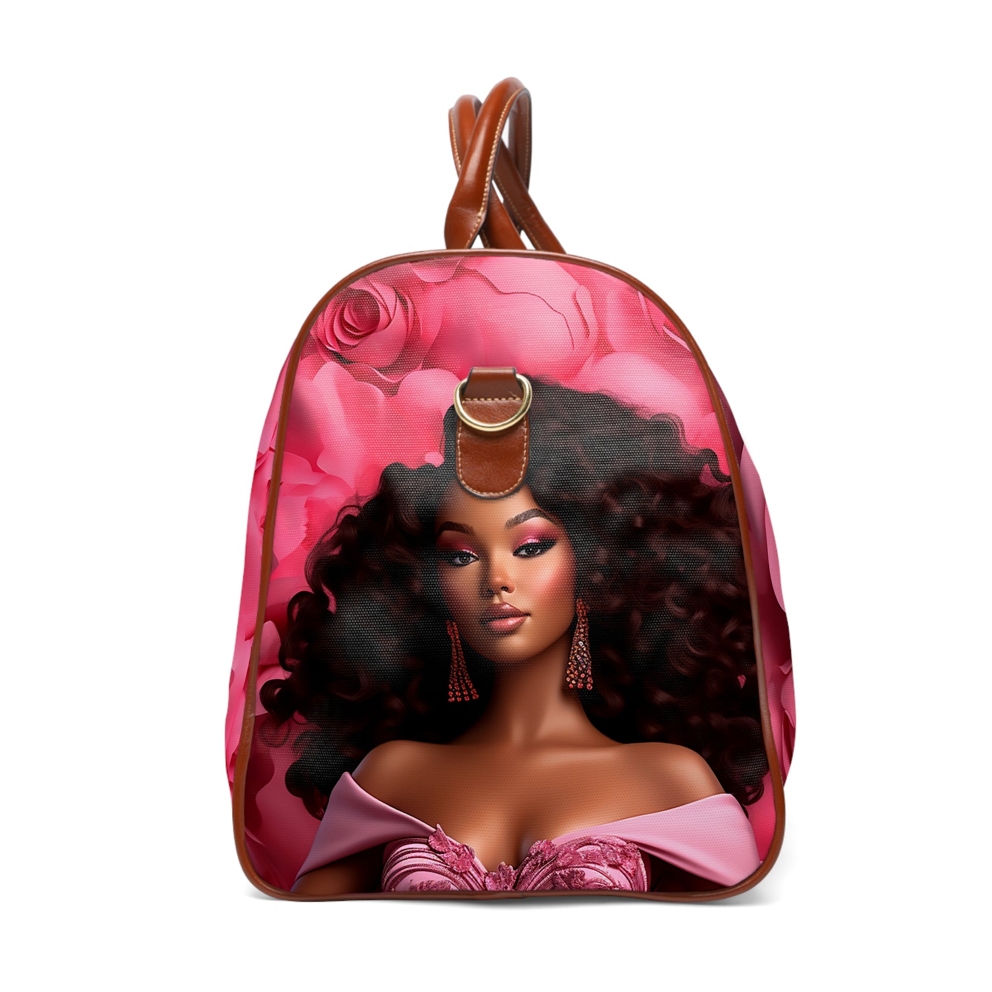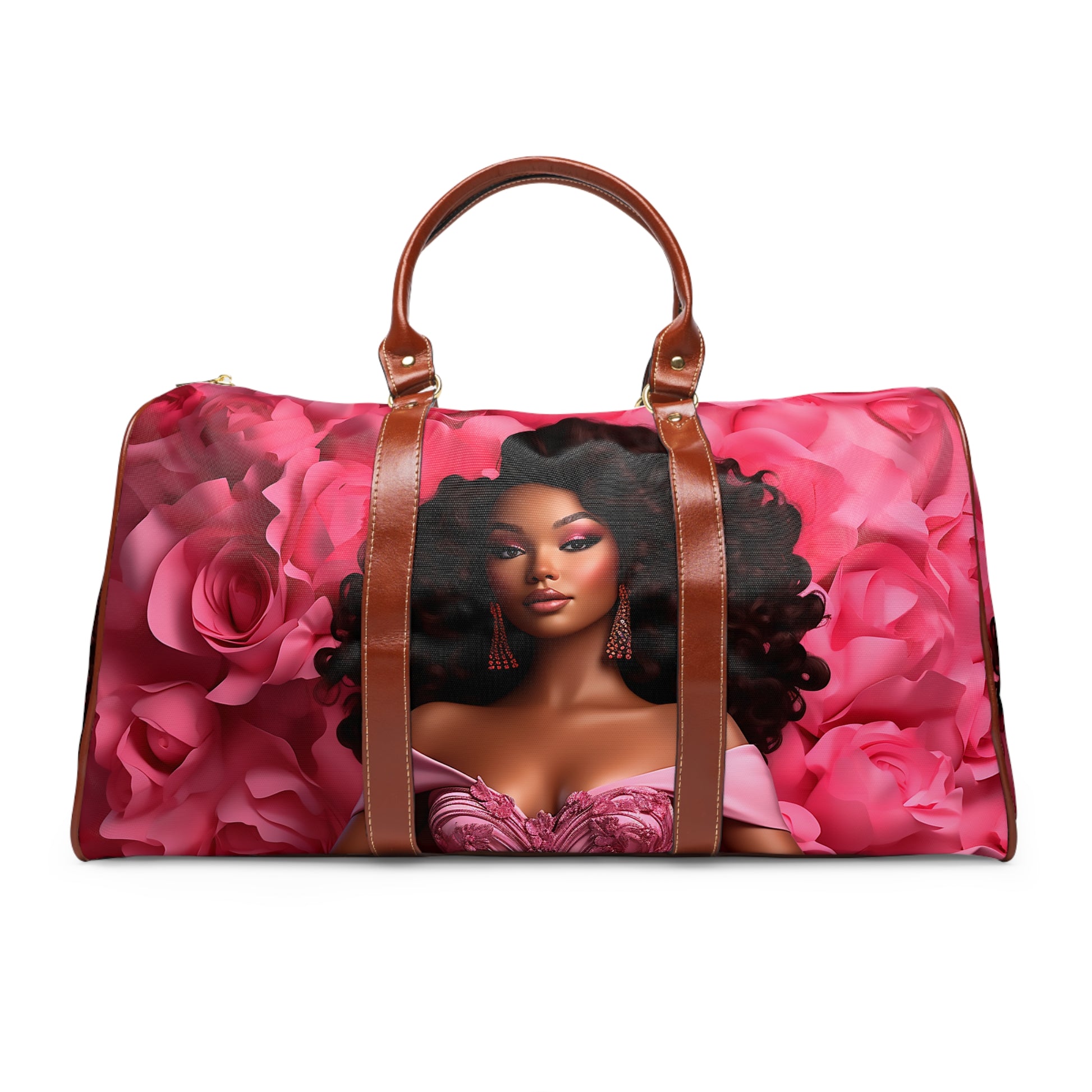 This personalized travel bag is all about style. Made with high-grade waterproof fabric, it's a highly durable means of transferring your essentials wherever you go. With multiple compartments, a resilient carrying handle, and an adjustable shoulder strap, it's the perfect companion for all your adventures. .: High-grade nylon material .: Microfiber PU leather top handle and binding .: One size: 20" × 12'' × 9" (50.8cm × 30.5cm × 23cm ) .: Brown PU leather handles and an adjustable shoulder strap .: Polyester lining .: Gold-colored zipper .: All-over print