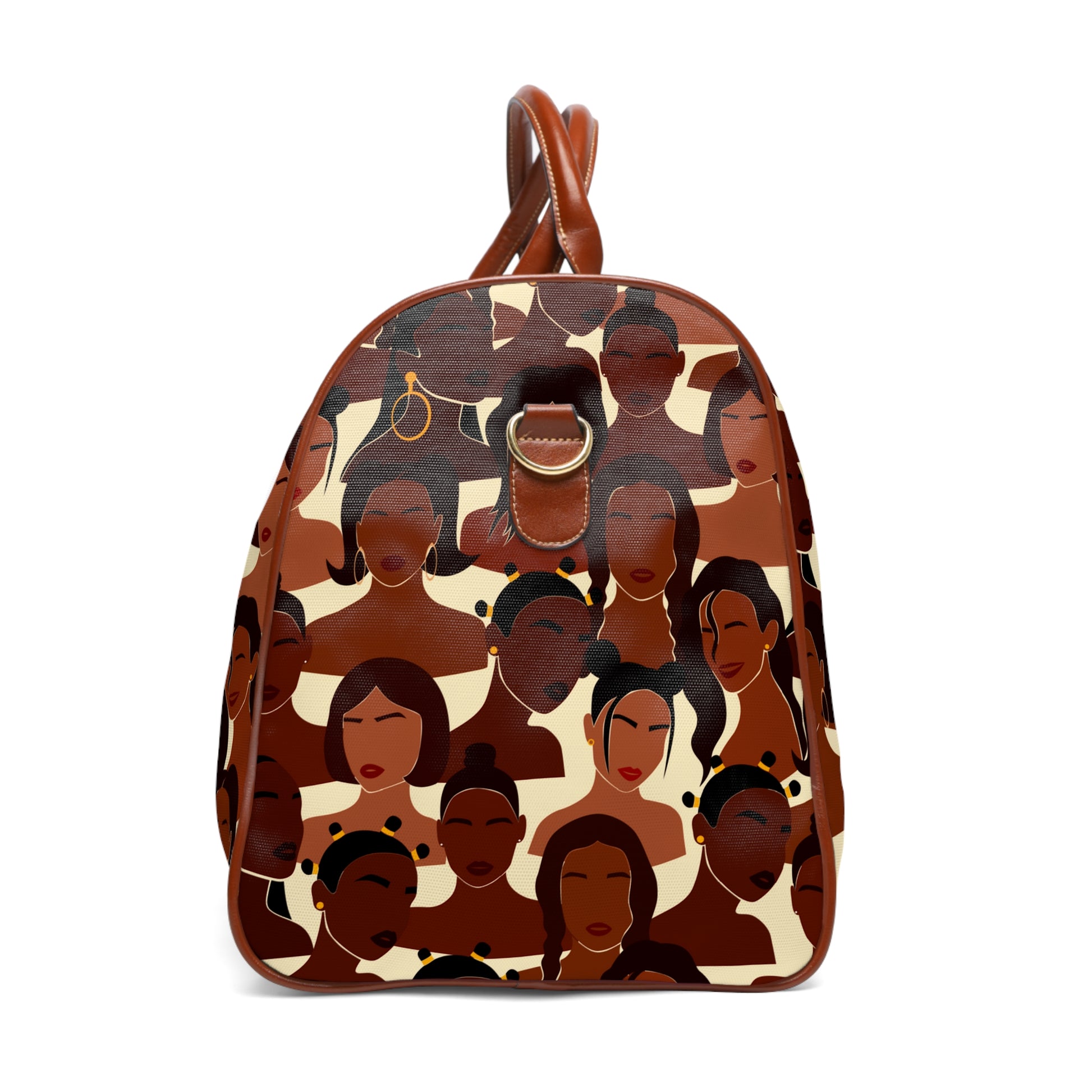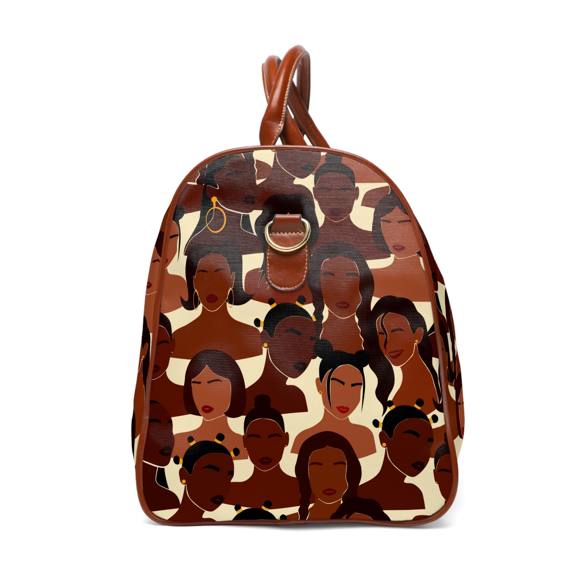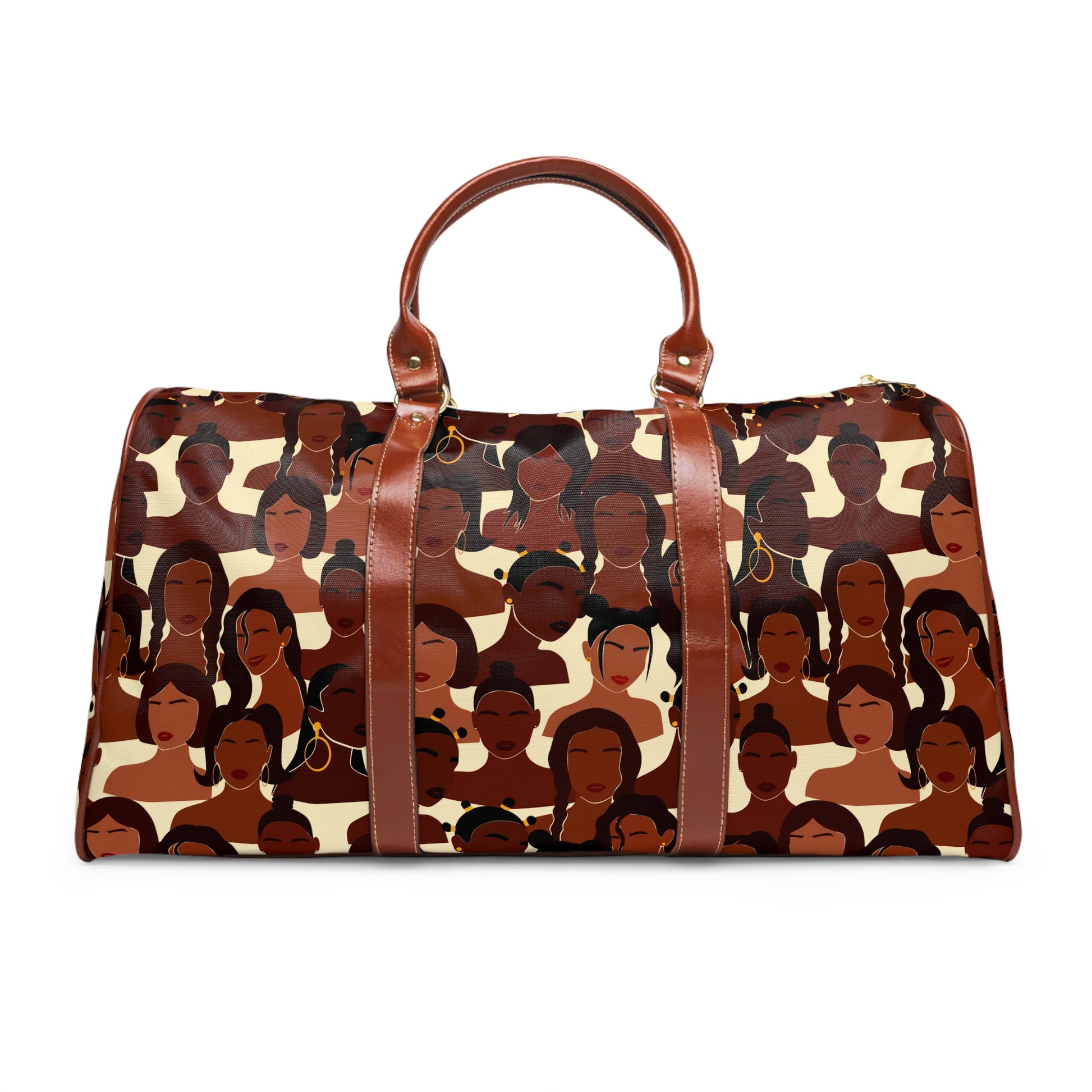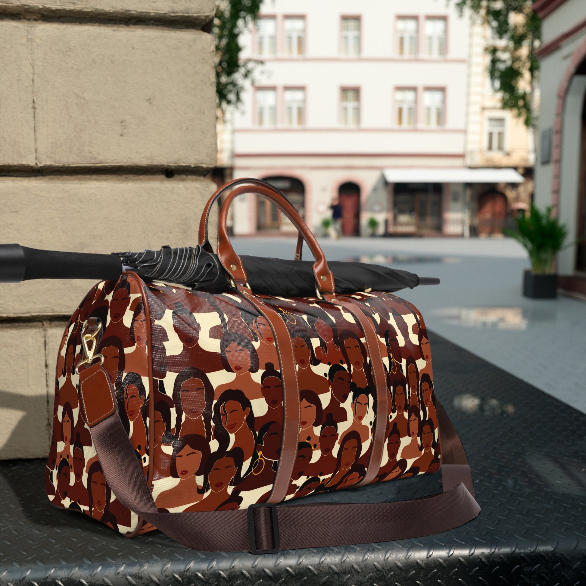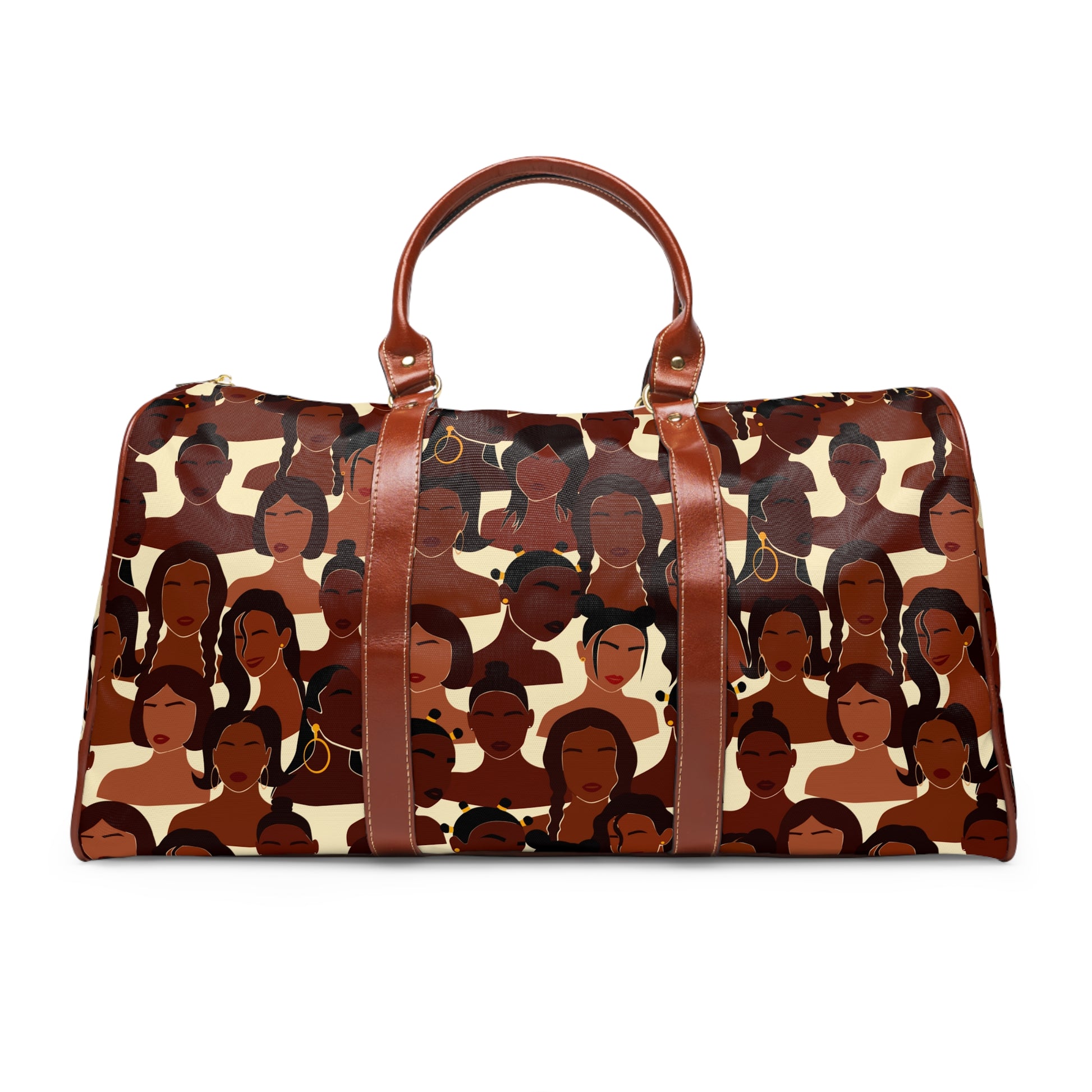 This personalized travel bag is all about style. Made with high-grade waterproof fabric, it's a highly durable means of transferring your essentials wherever you go. With multiple compartments, a resilient carrying handle, and an adjustable shoulder strap, it's the perfect companion for all your adventures. Features Include: - High-grade nylon material - Microfiber PU leather top handle and binding - One size: 20" × 12'' × 9" (50.8cm × 30.5cm × 23cm ) - Brown PU leather handles and an adjustable shoulder strap - Polyester lining - Gold-colored zipper - All-over print
