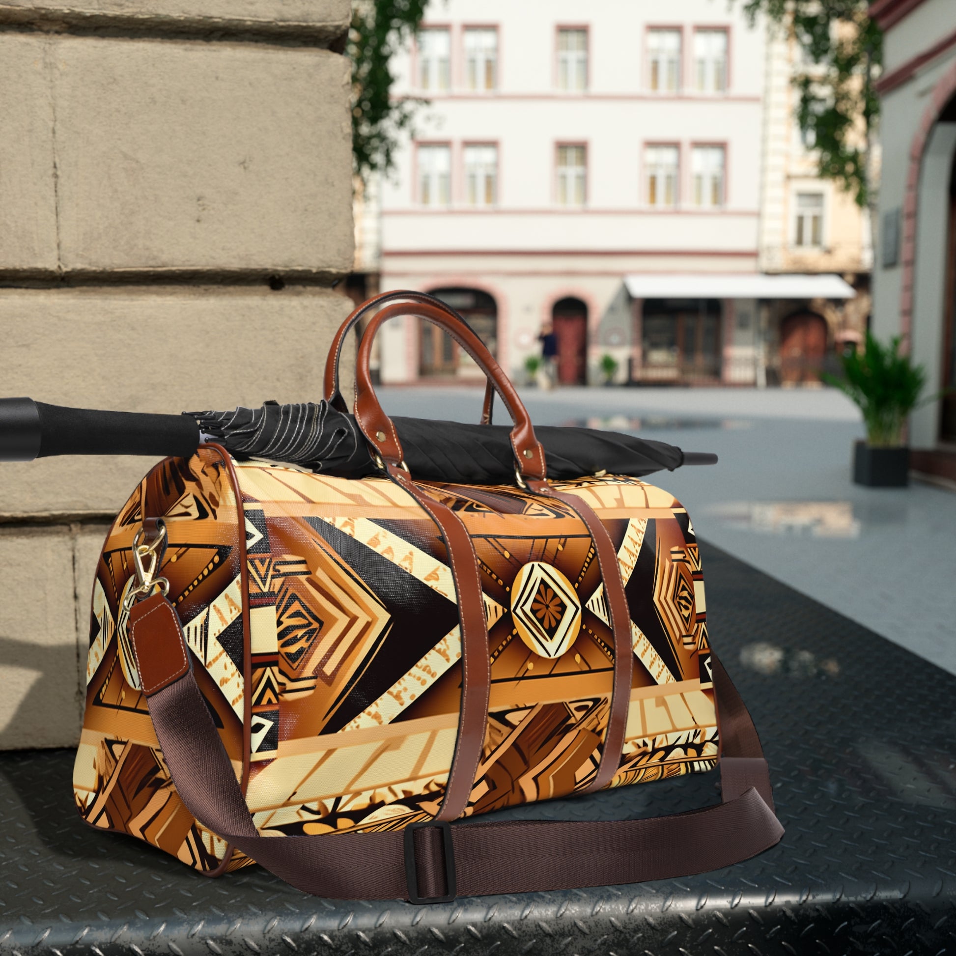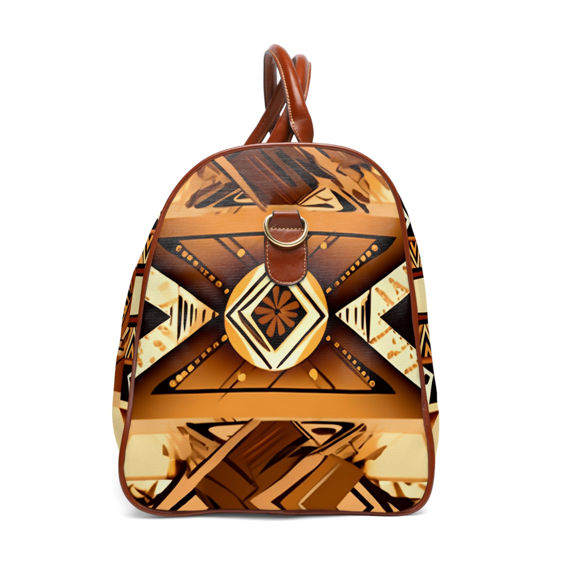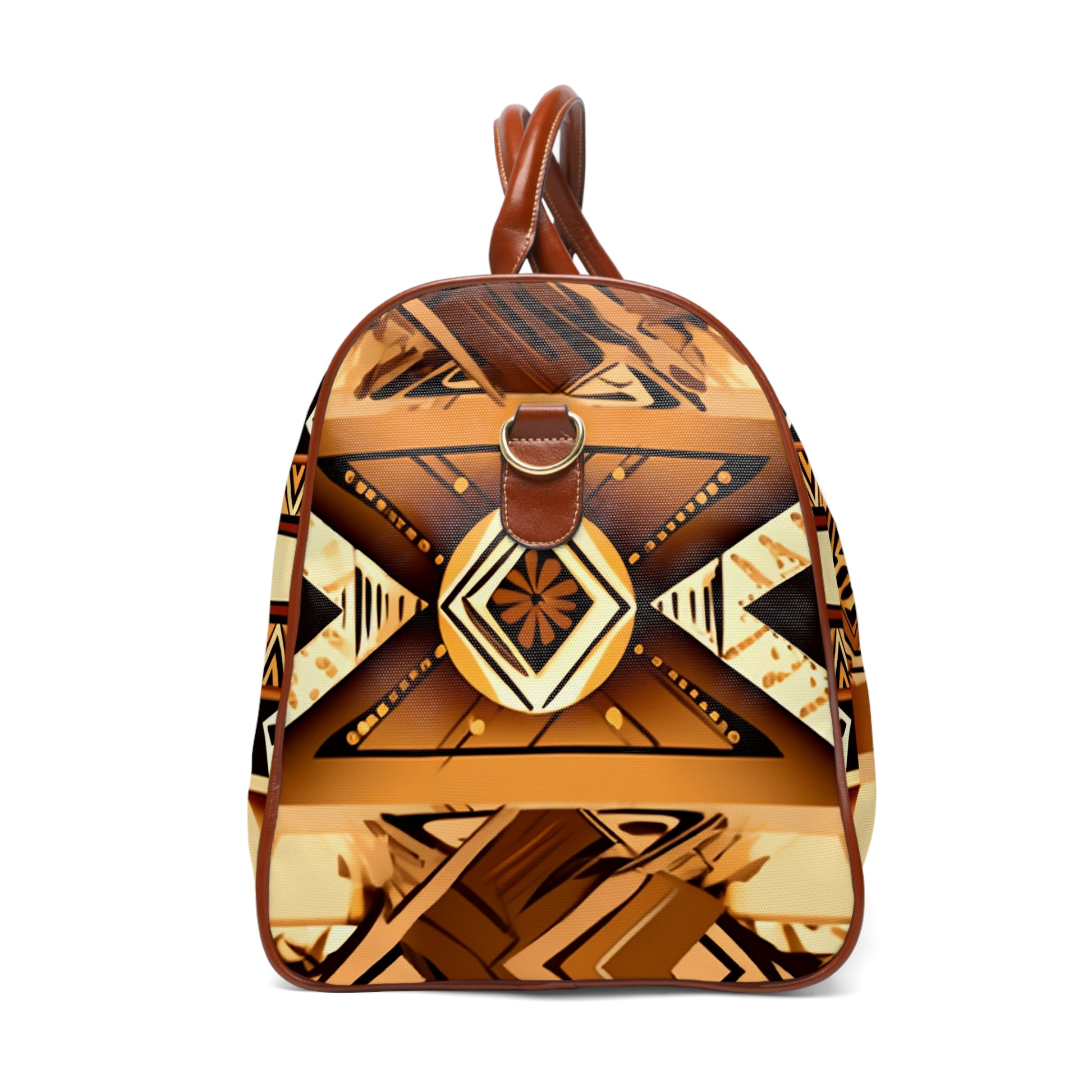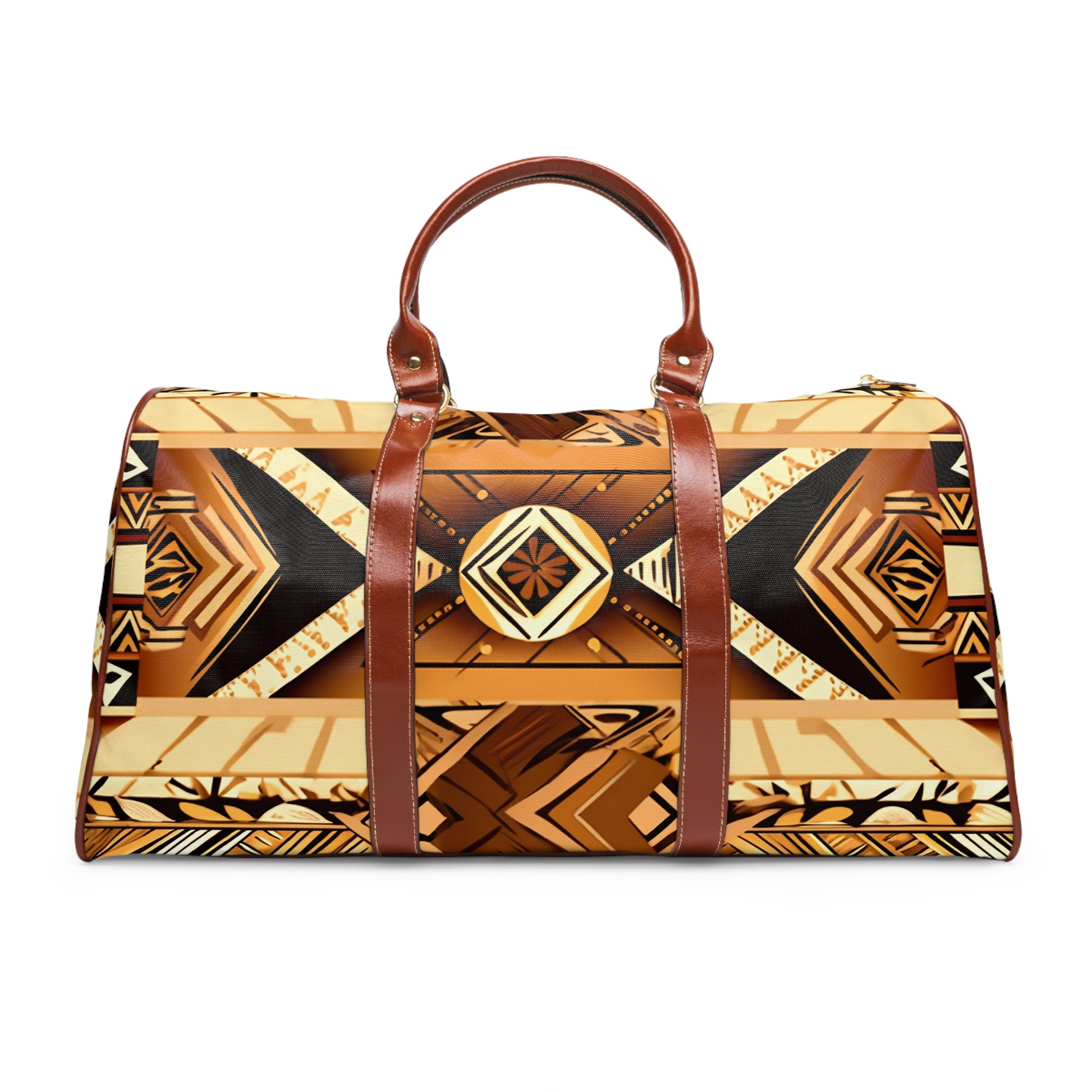 This personalized travel bag is all about style. Made with high-grade waterproof fabric, it's a highly durable means of transferring your essentials wherever you go. With multiple compartments, a resilient carrying handle, and an adjustable shoulder strap, it's the perfect companion for all your adventures. Features Include: - High-grade nylon material - Microfiber PU leather top handle and binding - One size: 20" × 12'' × 9" (50.8cm × 30.5cm × 23cm ) - Brown PU leather handles and an adjustable shoulder strap - Polyester lining - Gold-colored zipper - All-over print
