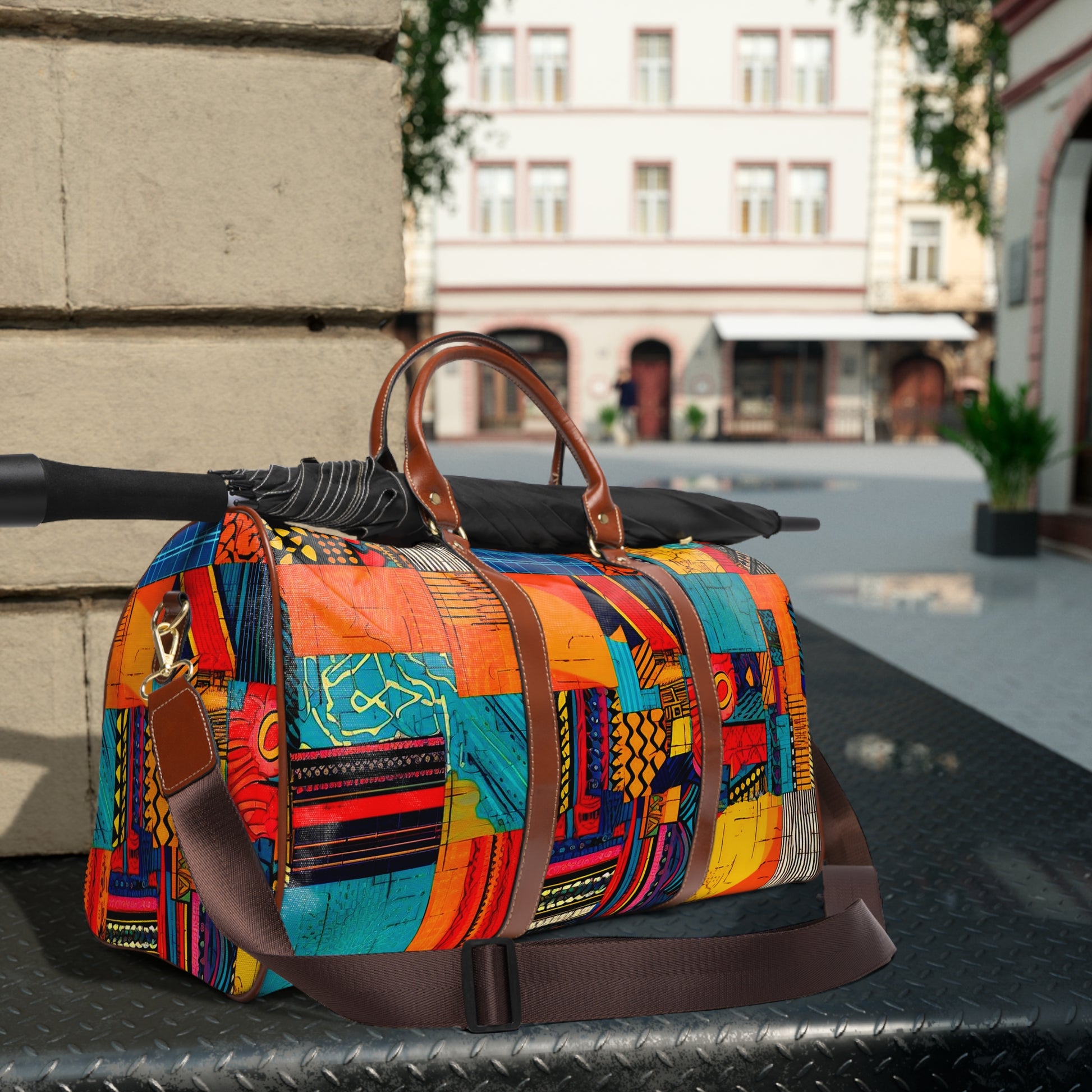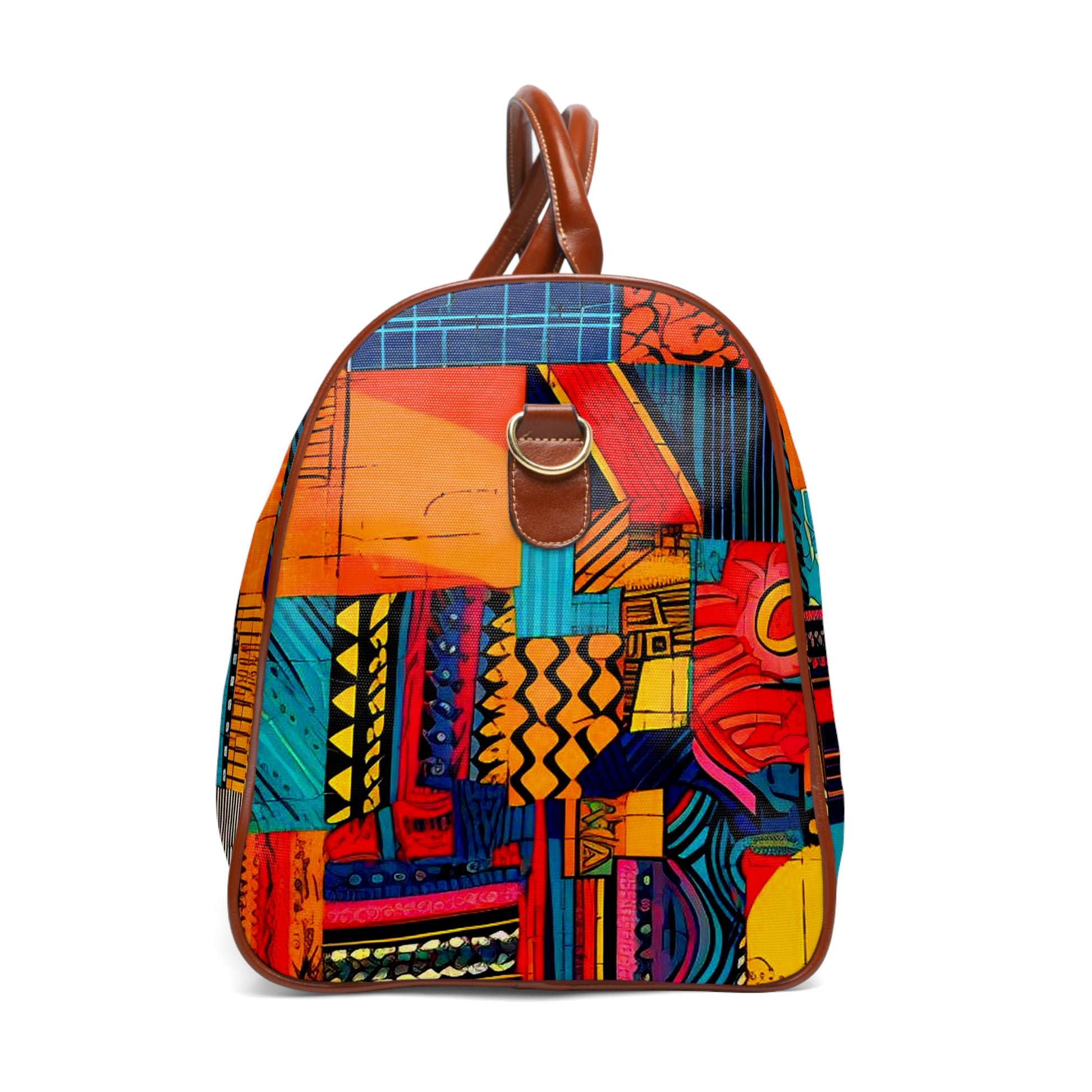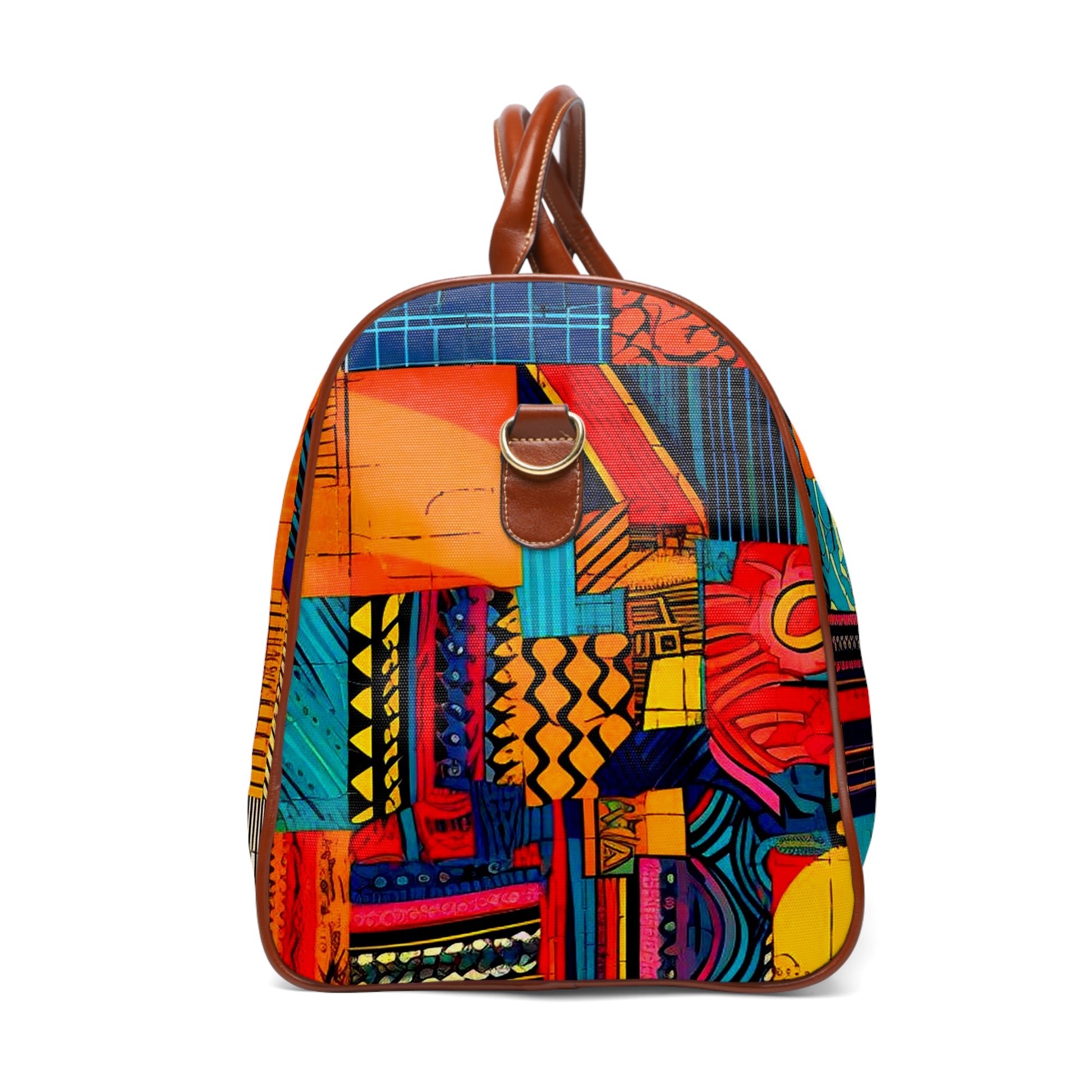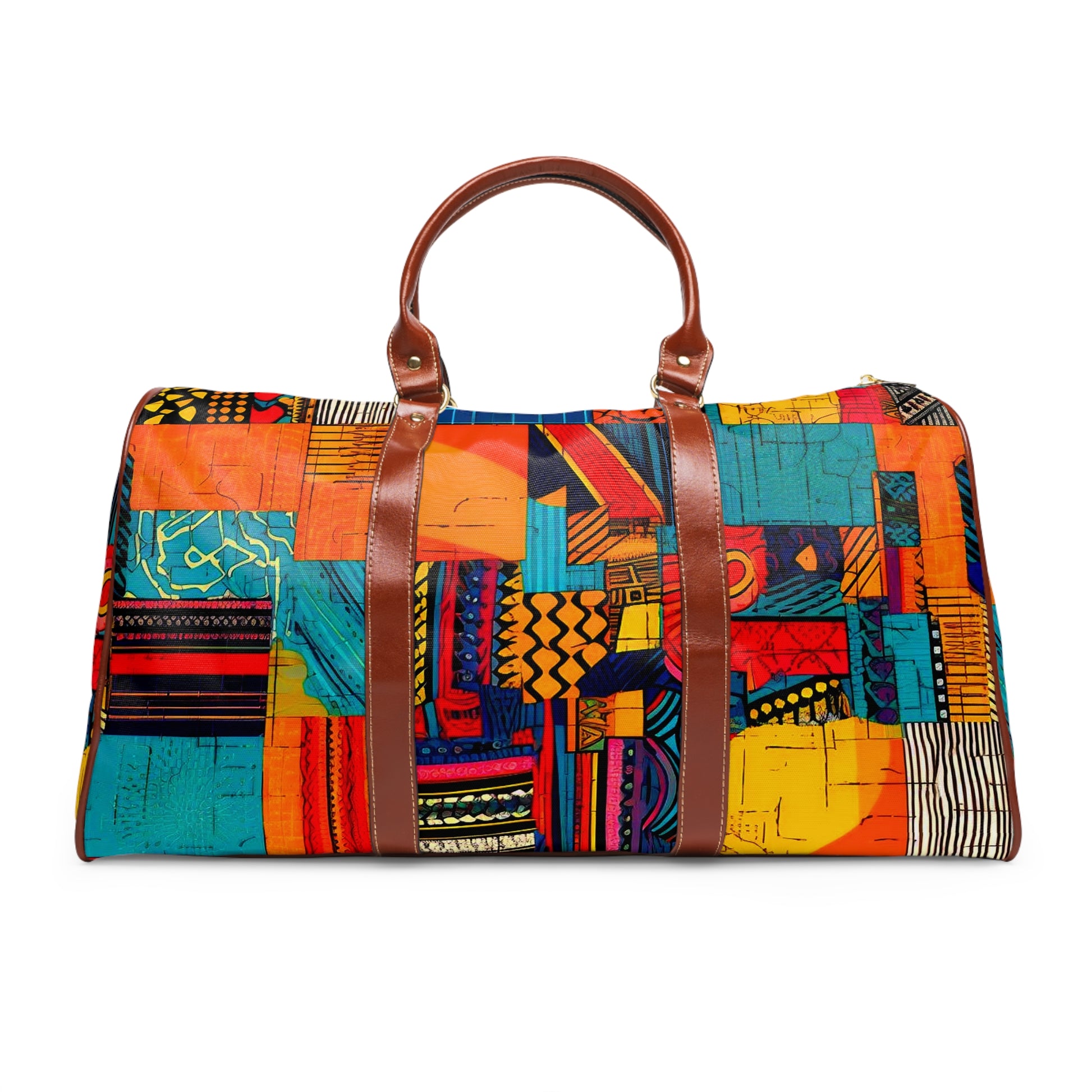 This personalized travel bag is all about style. Made with high-grade waterproof fabric, it's a highly durable means of transferring your essentials wherever you go. With multiple compartments, a resilient carrying handle, and an adjustable shoulder strap, it's the perfect companion for all your adventures. Features Include: - High-grade nylon material - Microfiber PU leather top handle and binding - One size: 20" × 12'' × 9" (50.8cm × 30.5cm × 23cm ) - Brown PU leather handles and an adjustable shoulder strap - Polyester lining - Gold-colored zipper - All-over print